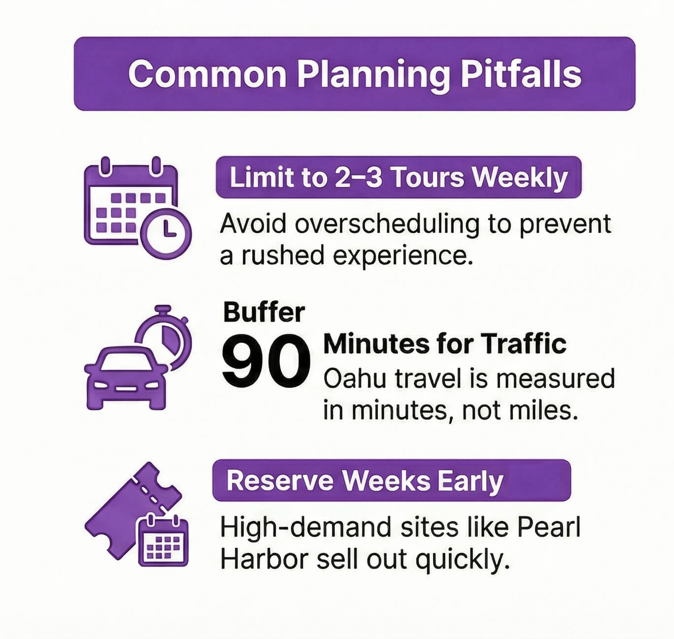 Most visitors book 2–3 tours on a weeklong trip—typically one cultural or historical experience, one outdoor/adventure activity, and one food or sightseeing tour. More than that often feels rushed with Oahu’s traffic and timing.